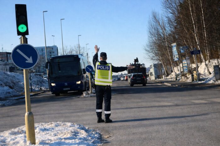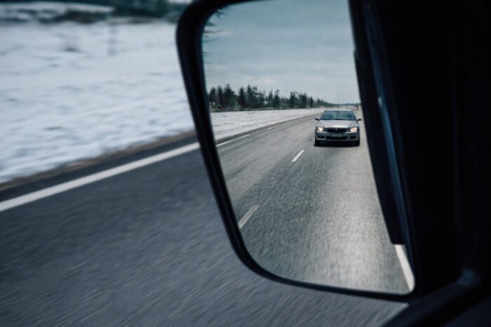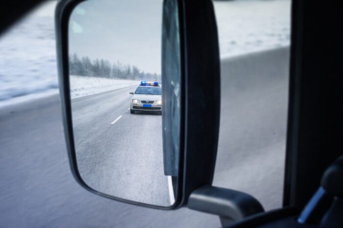 Polisbilen bakom har rött och blått ljus som växelvis blinkar. Vad ska du göra i denna situation?
