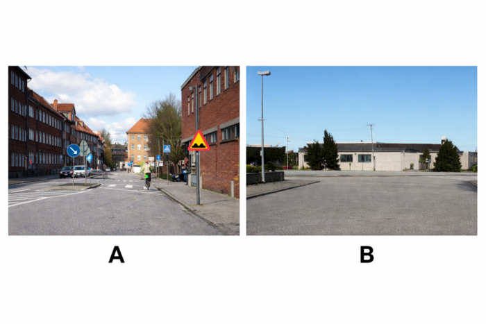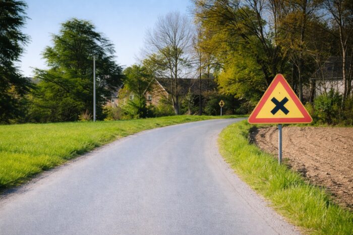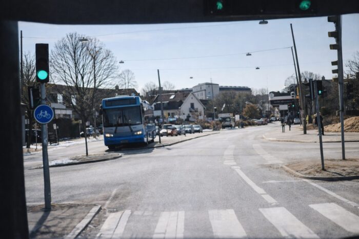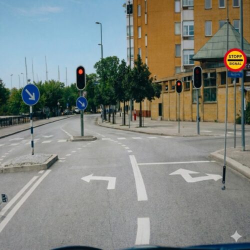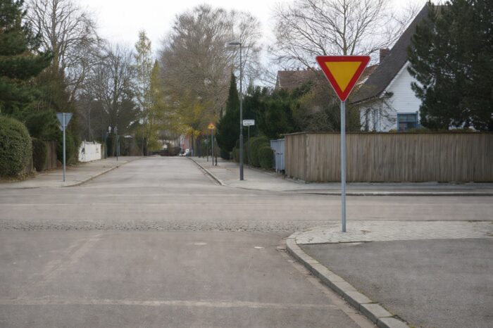 Du kör lastbil och ska svänga till vänster i den närmaste korsningen. Har du väjnings mot trafik från höger i någon av korsningarna?