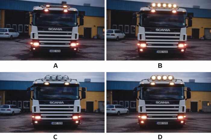 Vilken bild viser en belysningskombination som inte får användas vid färd?