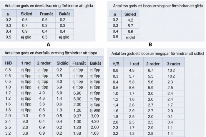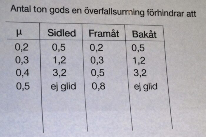 Du ska med hjälp av överfallsurrningar lastsäkra ett kos som väger 3 ton. Friktionskoefficinten 0,5. Hur många spännband behöver för att förhindra glidning framåt enligt tabellerna till höger?