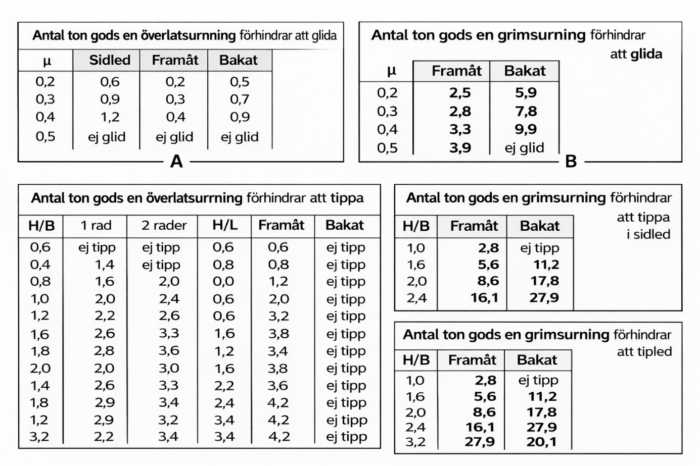 Du ska med hjälp av överfallssurningar lastsäkra ett kos som väger 2 ton. Friktionskoeffidenten är 0,3. Hur många spannband behövs för att förhindra glidning i sidled, enligt tabellerna till höger?